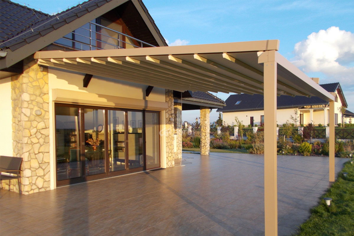 pergola ogrodowa z roletą cieniującą i tkaninowym dachem